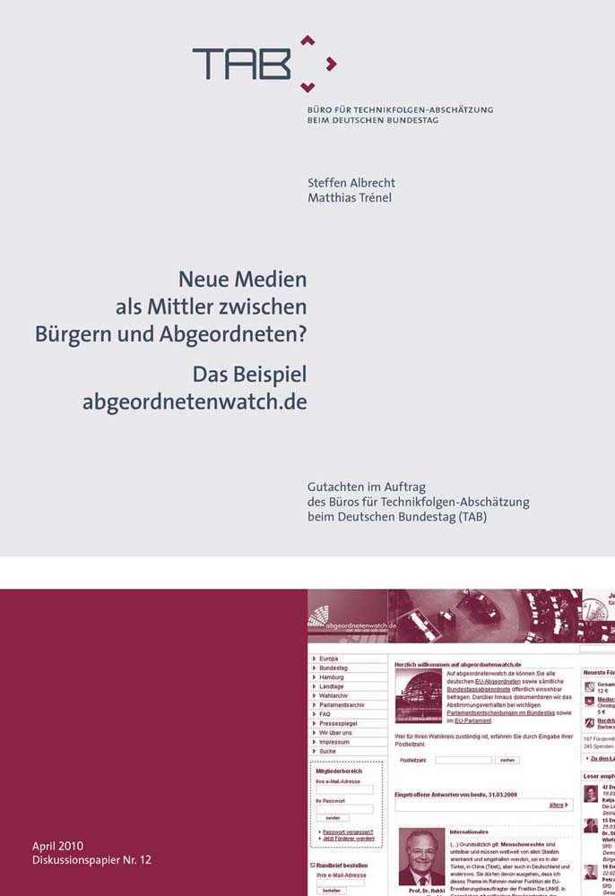 Auf Anregung aus dem Kreis der parlamentarischen Berichterstatter für Technikfolgenabschätzung hat sich das TAB mit der Internetplattform Abgeordnetenwatch.de befasst. Mit Unterstützung von Zebralog, Berlin, wurden u.a. das Geschäftsmodell von Abgeordnetenwatch.de beschrieben, die grundlegenden Ziele und Funktionsweisen herausgearbeitet sowie die tatsächliche Nutzung analysiert. Ferner wurden die Qualität der Fragen und Antworten inhaltsanalytisch beurteilt und Abgeordnetenwatch.de mit ähnlichen E-Demokratie-Projekten im In- und Ausland verglichen.