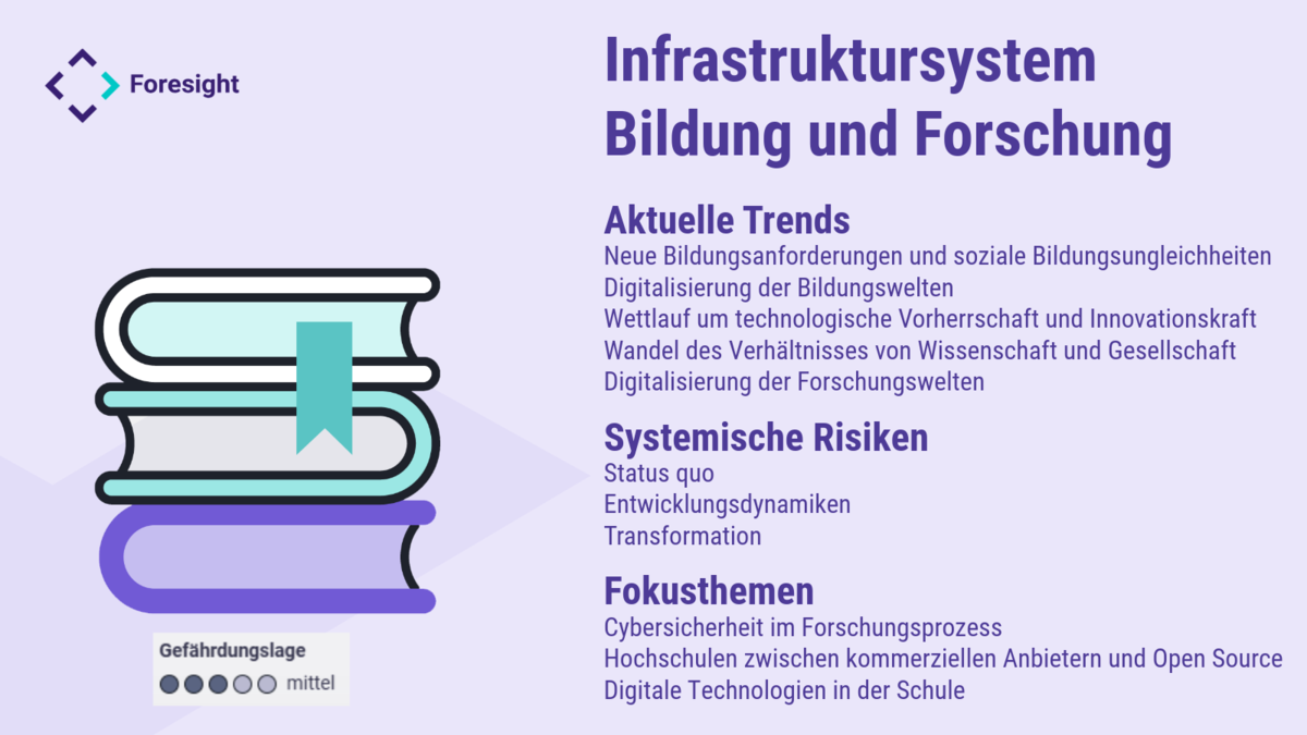 Der Bereich Bildung und Forschung wird derzeit vor allem durch Personalengpässe, gesellschaftliche Polarisierung sowie Technikversagen und eingeschränkte Technikbeherrschbarkeit gefährdet. Mit wachsender Systemkomplexität und fortschreitender Digitalisierung verstärkt sich insbesondere die Gefährdungslage durch immer professioneller werdende Cyberangriffe und eingeschränkte Technikbeherrschbarkeit. Zusätzlich verstärken geopolitische Konflikte den Druck auf das Forschungssystem und erschweren internationale Kooperationen.