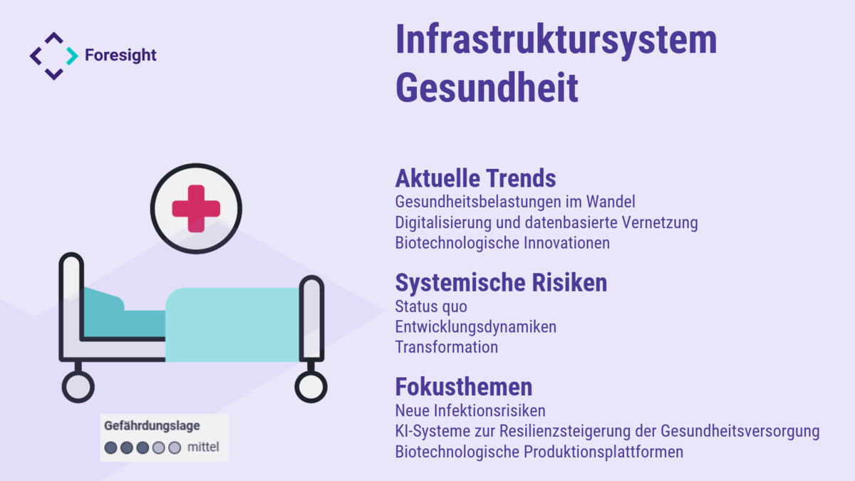 Die neuen Foresight-Reports widmen sich den zentralen Infrastruktursystemen Bildung und Forschung, Gesundheit sowie Wasser. Auf Basis einer fundierten Trendanalyse werden Trendcluster identifiziert, die aus Sicht der Technikfolgenabschätzung die künftige Entwicklung dieser Systeme prägen werden. Darüber hinaus wird die aktuelle und zukünftige Gefährdungslage durch systemische Risiken bewertet und es wird beleuchtet, wie Pfadabhängigkeiten die angestrebten Transformationsziele beeinflussen. Jeder Report schließt mit der Beschreibung von drei Fokusthemen, die im Resilienz-Check vertieft werden können.