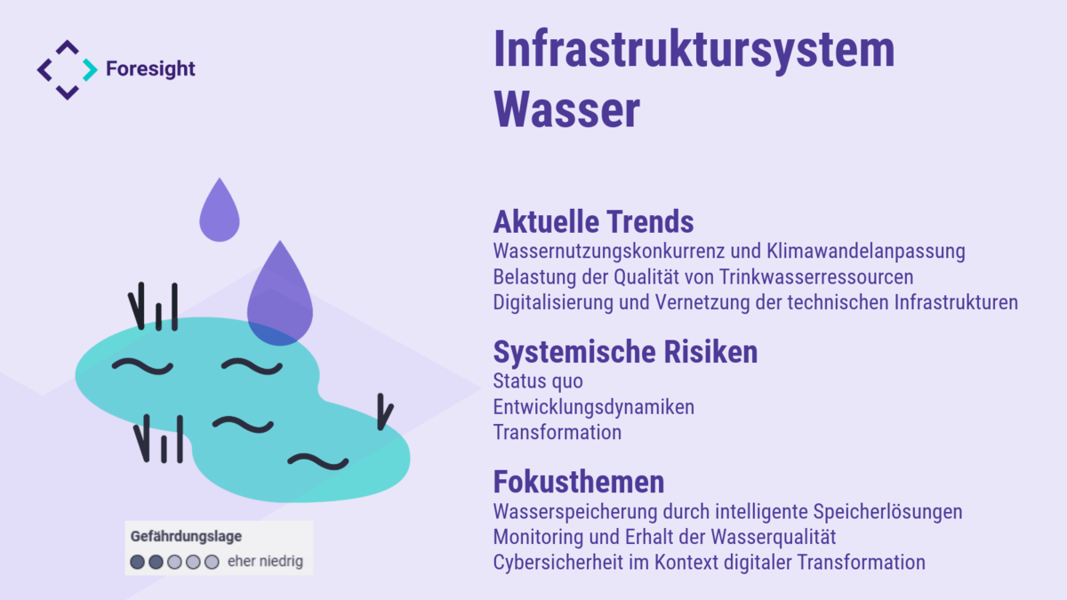 Im Infrastruktursystem Wasser stellen klimawandelbedingte Wetterextreme wie Dürren und Starkregen die größte Herausforderung dar, während die fortschreitende Digitalisierung ohne ausreichende Sicherheitsvorkehrungen zusätzliche Risiken durch Cyberkriminalität mit sich bringt.