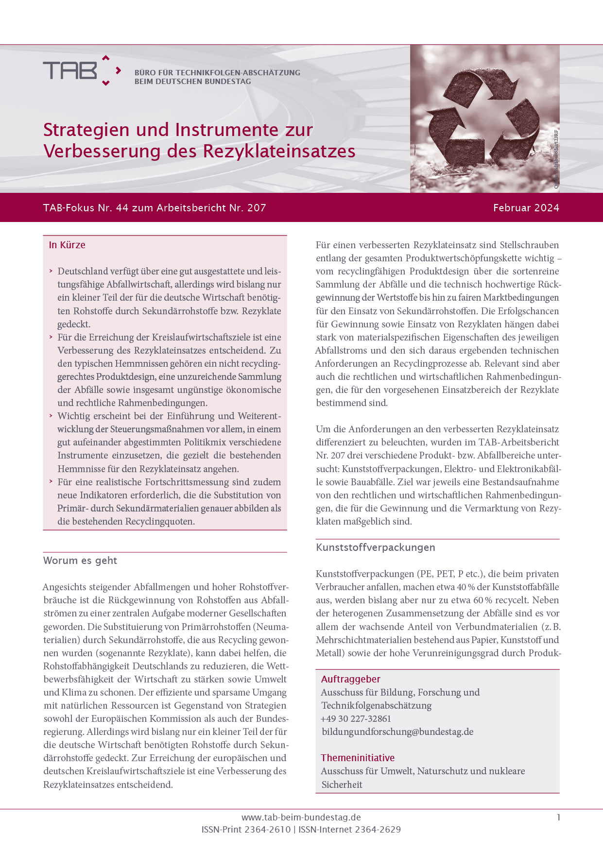 TAB-Fokus no. 44 Strategies and instruments for improving the use of recycled materials (PDF) The policy brief TAB-Fokus offers a compact overview of the content and results of our TA analyses on four pages. |